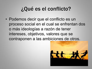 El documento describe los tipos y causas de conflictos en equipos de trabajo, así como estrategias para manejarlos de manera productiva. Explica que los conflictos funcionales pueden generar tensión creativa, mientras que los disfuncionales interfieren con los objetivos. Señala que para resolver conflictos se debe estar dispuesto a cooperar, reconocer errores y encontrar compromisos.