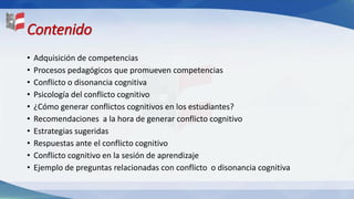 Este documento presenta información sobre el conflicto o disonancia cognitiva. Brevemente describe que el conflicto cognitivo ocurre cuando lo que el estudiante sabe entra en contradicción con nueva información, generando un desequilibrio que motiva el aprendizaje. Luego explica cómo generar conflictos cognitivos en los estudiantes mediante preguntas, exploraciones y diálogos que presenten desafíos. Finalmente, da ejemplos de preguntas relacionadas con el conflicto cognitivo.
