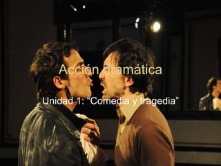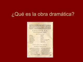La obra dramática se caracteriza por su capacidad de ser representada teatralmente. Lo fundamental es la acción, la cual depende del conflicto entre fuerzas opuestas que luchan por imponerse. El conflicto se presenta al inicio, luego se desarrolla volviéndose más tenso hasta alcanzar un punto máximo de tensión llamado clímax, para finalmente resolverse con la victoria de una fuerza sobre la otra en el desenlace.