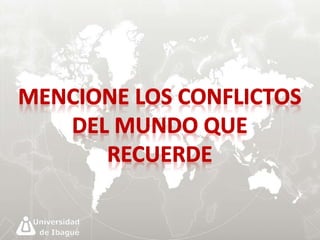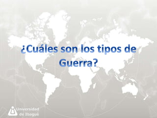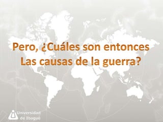 Este documento resume los principales tipos y causas de conflictos internacionales. Describe las guerras actuales y pasadas en todo el mundo, así como los diferentes tipos de guerra como las guerras hegemónicas, totales, limitadas y civiles. También analiza los conflictos basados en ideas como los étnicos, religiosos e ideológicos, así como los conflictos de intereses como los territoriales, de control de gobiernos y económicos. Finalmente, examina las causas individuales, domésticas, interestatales y globales de la gu