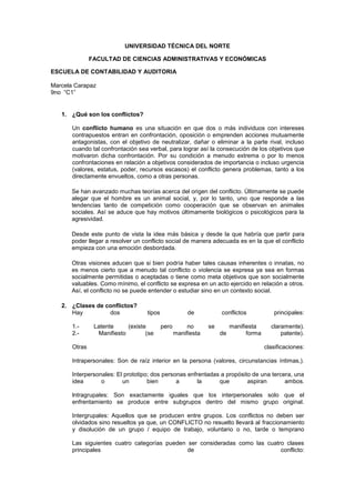 1) El documento habla sobre los diferentes tipos de conflictos que pueden ocurrir, incluyendo conflictos latentes vs manifiestos, intrapersonales vs interpersonales vs intragrupales vs intergrupales.