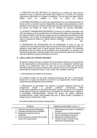 2) También describe cuatro categorías principales de conflictos: conflictos de rol múltiple, recursos escasos, valores y prioridades diferentes, y diferencias de percepción.