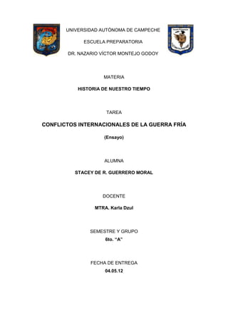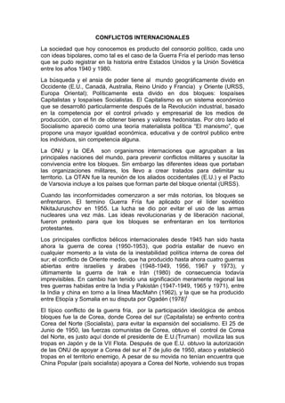 El documento resume tres conflictos internacionales clave de la Guerra Fría: la guerra de Corea (1950-1953), la guerra de Vietnam (1955-1975), y la revolución cubana (1959). En cada caso, los bloques capitalistas y socialistas apoyaron a lados opuestos, lo que llevó a enfrentamientos prolongados. La guerra de Corea terminó en un punto muerto a lo largo del paralelo 38, mientras que Vietnam del Norte derrotó a Vietnam del Sur. Cuba logró la independencia pero quedó aislada por un bloqueo de Estados Unidos