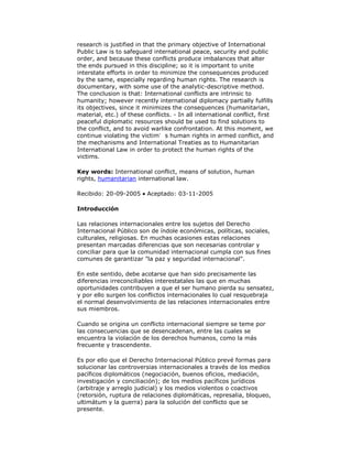1) El documento analiza los conflictos internacionales, sus medios de solución y la situación de los derechos humanos de las víctimas según el Derecho Internacional Humanitario. 2) Define los conflictos internacionales y distingue entre conflictos de orden jurídico y político. 3) Examina los medios pacíficos (diplomáticos y jurídicos) y medios violentos para resolver conflictos, concluyendo que se deben agotar primero los medios pacíficos.