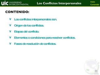 Los conflictos interpersonales pueden causar ansiedad y problemas de salud, pero también pueden motivar el cambio. Existen varias etapas en un conflicto, desde la falta de entendimiento hasta el enfrentamiento abierto. Para resolverlos de manera positiva, se debe comunicar claramente, controlar las emociones, buscar entender diferentes perspectivas, y negociar para encontrar soluciones que beneficien a todas las partes.