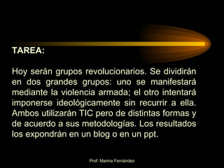 El documento propone un ejercicio de simulación en el que los estudiantes se dividirán en dos grupos revolucionarios, uno que usará la violencia y otro que no. Ambos grupos utilizarán las TIC para difundir sus ideologías y objetivos. Los estudiantes investigarán sobre el uso de TIC en movimientos sociales y crearán un blog o presentación para anunciar su movimiento ficticio.