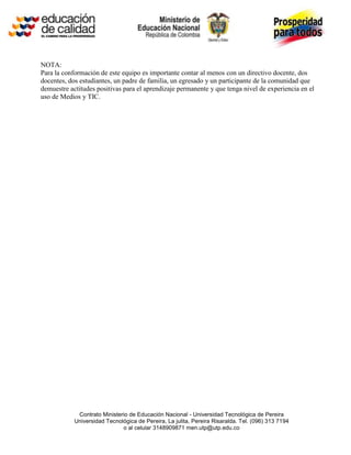 El documento presenta la conformación de un equipo de gestión para la apropiación profesional de TIC en una institución educativa rural. El equipo incluye al rector, dos docentes, dos estudiantes, una coordinadora, una madre de familia, un egresado y una participante de la comunidad. La conformación del equipo requiere como mínimo un directivo docente, dos docentes, dos estudiantes, un padre de familia y un egresado con experiencia en el uso de TIC.