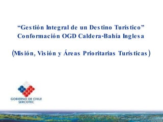 Este documento describe los esfuerzos para organizar la gestión integral del destino turístico de Caldera-Bahía Inglesa en Chile. Propone la creación de una Organización de Gestión de Destino (OGD) con una misión de promover el desarrollo sostenible a través de mejorar la competitividad de atractivos y productos turísticos con identidad. La visión es posicionar el destino en los mercados generando un crecimiento sostenido en la demanda y gasto turístico que mejore la calidad de vida local.