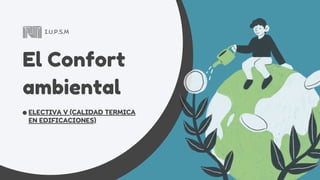 El documento aborda el concepto de confort ambiental, definiendo su relación con la temperatura, humedad y movimiento del aire que afectan el bienestar físico y psicológico. Se discuten los parámetros ambientales y arquitectónicos que influyen en la percepción del confort térmico, así como factores climáticos y personales que impactan esta sensación. Además, se menciona la importancia de las cartas bioclimáticas en la representación de las condiciones óptimas de confort térmico.