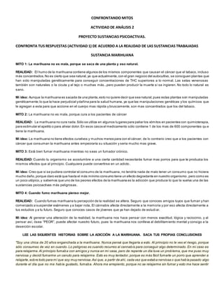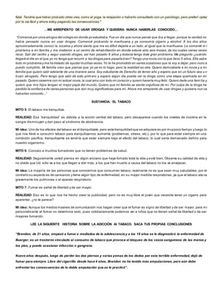 Este documento presenta varios mitos comunes sobre sustancias psicoactivas como la marihuana, el tabaco y el alcohol, y proporciona realidades basadas en evidencia científica para contrarrestar esos mitos. Incluye historias personales sobre los efectos dañinos de la adicción a estas sustancias. El objetivo general es confrontar creencias erróneas sobre estas drogas y crear conciencia sobre sus verdaderos riesgos para la salud.