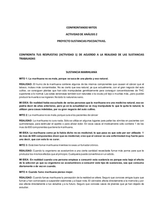 Este documento confronta varios mitos comunes sobre sustancias psicoactivas como la marihuana, el tabaco y el alcohol. Explica las realidades científicas detrás de cada sustancia y cómo su consumo puede conducir a la adicción y daños a la salud. También incluye historias personales que ilustran los efectos negativos a largo plazo del abuso de drogas y la dificultad de dejarlas. El objetivo general es promover una comprensión más precisa sobre estos temas y desalentar el consumo de sust