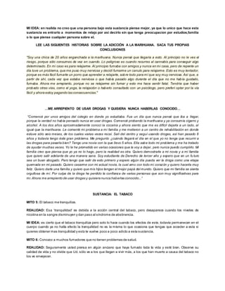 Este documento confronta varios mitos comunes sobre sustancias psicoactivas como la marihuana, el tabaco y el alcohol. Explica las realidades científicas detrás de cada sustancia y cómo su consumo puede conducir a la adicción y daños a la salud. También incluye historias personales que ilustran los efectos negativos a largo plazo del abuso de drogas y la dificultad de dejarlas. El objetivo general es promover una comprensión más precisa sobre estos temas y desalentar el consumo de sust