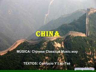 Este documento presenta las enseñanzas de los sabios chinos Confucio y Lao Tse. Contiene numerosas citas atribuidas a estos pensadores sobre temas como el trabajo, el aprendizaje, la sabiduría, la naturaleza humana y el cultivo del carácter. También incluye breves descripciones de la música clásica china y algunas imágenes ilustrativas. El objetivo es compartir la filosofía y las enseñanzas morales de estas importantes figuras de la antigua China.