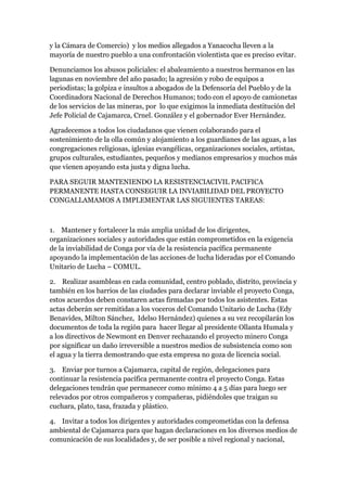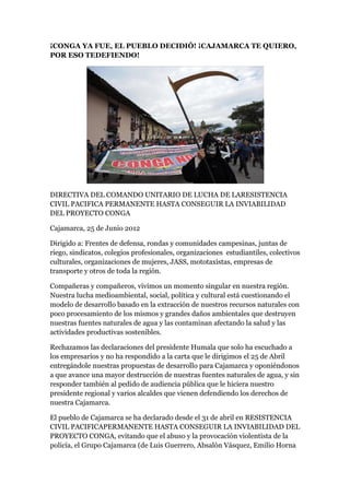 El documento es una directiva del Comando Unitario de Lucha de la Resistencia Civil Pacífica Permanente de Cajamarca que llama a continuar la resistencia pacífica hasta lograr invalidar el proyecto minero Conga. Detalla siete tareas como fortalecer la unidad, realizar asambleas comunales, enviar delegaciones a Cajamarca, pedir declaraciones a líderes, apoyar con víveres, pedir cartas de apoyo, y prepararse para otra marcha nacional.