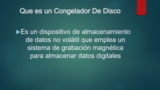 Este documento describe los congeladores de disco duro, que son dispositivos de almacenamiento no volátiles que usan grabación magnética para almacenar datos digitales. Un ejemplo es Deep Freeze, que permite trabajar normalmente con el disco duro pero restaura su contenido original cada vez que se reinicia, eliminando cualquier cambio. Tiene la ventaja de proteger el sistema pero la desventaja es que requiere activarse y desactivarse frecuentemente, lo que hace su uso incómodo.