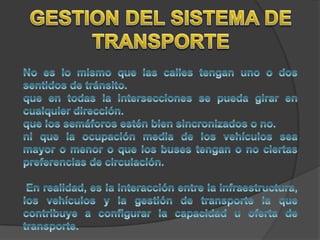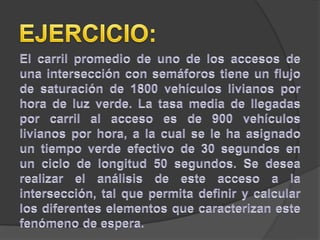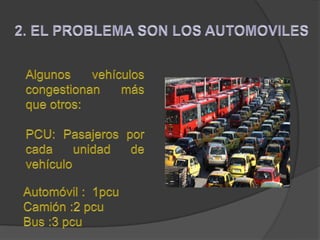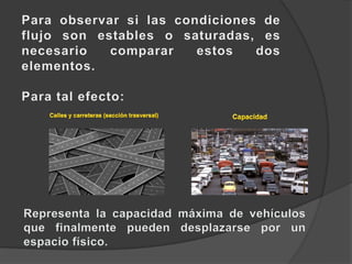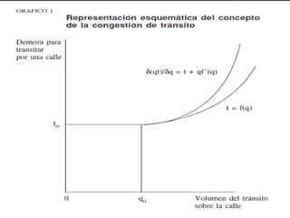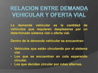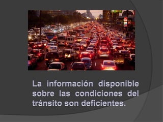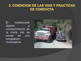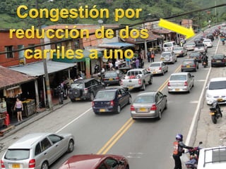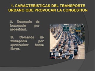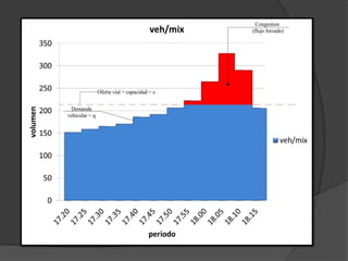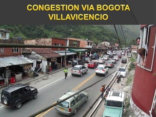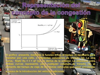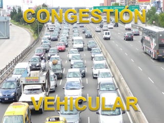 La congestión vehicular ocurre cuando la demanda de tránsito supera la capacidad de las vías. Esto causa una acumulación de vehículos, pérdida de velocidad e incremento en los tiempos de viaje. Comúnmente sucede durante las horas pico cuando hay un exceso de demanda para la oferta vial disponible.