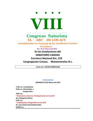 Este documento presenta el programa de una conferencia sobre el manejo de accidentes cerebrovasculares. Se detallan los conferencistas y sus temas, incluyendo médicos, patólogos, nutricionistas y terapeutas. El programa cubre temas como prevención, diagnóstico, rehabilitación, alimentación, terapias y cirugía para el tratamiento de ACV. Incluye conferencias magistrales, talleres y graduación de alumnos durante dos días.