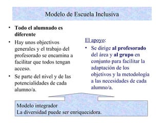 El documento describe un modelo de escuela inclusiva que apoya la diversidad en las aulas ordinarias. Todos los estudiantes reciben apoyo de acuerdo a sus necesidades individuales a través de estrategias de colaboración entre profesores. El apoyo se enfoca en facilitar el acceso a los objetivos para todos mediante la adaptación de la metodología y los materiales a cada estudiante. El trabajo en equipo entre profesores de apoyo y de aula es fundamental para atender a la diversidad de necesidades en el aula de manera integradora.