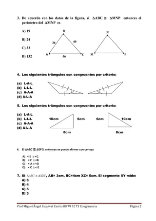 El documento presenta 22 problemas de geometría que involucran triángulos congruentes. Los problemas piden identificar medidas de ángulos, lados y perímetros basados en la congruencia de triángulos dados, así como también identificar criterios de congruencia que satisfacen pares de triángulos.