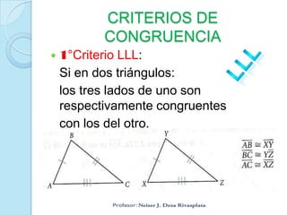 Los triángulos son congruentes si tienen la misma forma y tamaño, y se identifica su congruencia mediante el símbolo ~. Existen tres criterios para determinar la congruencia: lados congruentes (LLL), lados y ángulo congruentes (LAL), y ángulos y lado entre ellos congruentes (ALA). Además, se mencionan aplicaciones de la congruencia como teoremas de la bisectriz, mediatriz y mediada relativa a la hipotenusa.