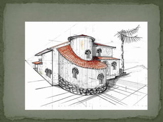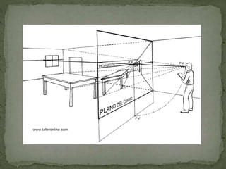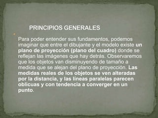 El documento explica los fundamentos de la perspectiva para dibujantes, incluyendo la línea de horizonte, el punto de vista, y los puntos de fuga. Define tres tipos de perspectivas - paralela, oblicua, y aérea - según la posición del espectador frente al modelo.