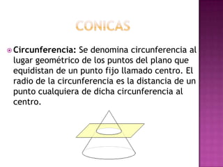 El documento define las características geométricas de la circunferencia, elipse, hipérbola y parábola. La circunferencia es el lugar geométrico de puntos que equidistan de un punto central llamado centro. La elipse es el lugar geométrico de puntos cuya suma de distancias a dos focos es constante. La hipérbola es el lugar geométrico de puntos cuya diferencia de distancias entre dos focos es constante. La parábola es el lugar geométrico de puntos que equidistan de un foco y