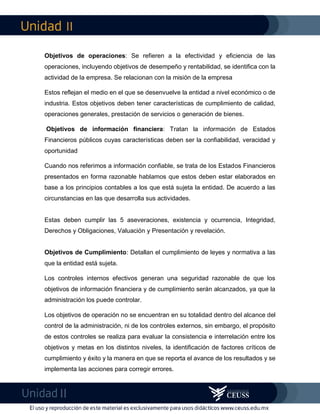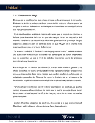 El documento habla sobre la valoración del riesgo en una compañía. Explica que el riesgo es la posibilidad de errores en los procesos de la compañía y que el riesgo de auditoría es la probabilidad de que el auditor emita un informe que no refleje correctamente la realidad de la entidad auditada. También describe los diferentes tipos de objetivos de una organización, los riesgos inherentes, de control y de detección, y la importancia de gestionar el cambio.