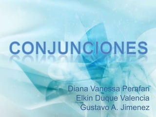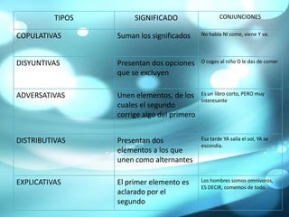 Este documento describe las conjunciones, palabras que unen palabras u oraciones. Explica que las conjunciones no varían en género o número y no tienen significado propio. Identifica dos tipos de conjunciones: coordinantes, que unen elementos independientes de igual categoría; y subordinantes, que unen una oración dependiente de otra. También menciona las locuciones conjuntivas, grupos de palabras que funcionan como conjunciones.