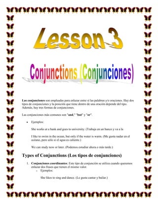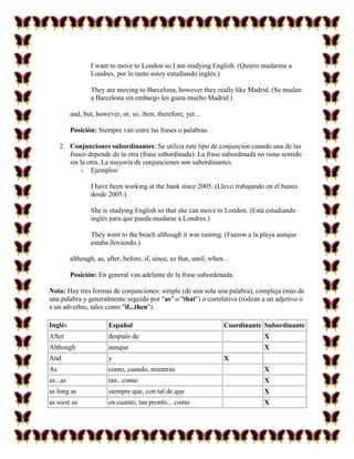 El documento describe los diferentes tipos de conjunciones y su uso. Hay dos tipos principales de conjunciones: coordinantes y subordinantes. Las coordinantes enlazan oraciones de igual valor, mientras que las subordinantes unen oraciones donde una depende de la otra. Algunas conjunciones comunes son "and", "but", "or", así como "after", "although", "since", "so that", las cuales pueden ser coordinantes u subordinantes dependiendo de su uso.