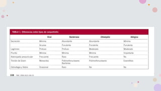 Este documento describe las conjuntivitis agudas y crónicas. Explica la anatomía de la conjuntiva y los signos clínicos de diferentes tipos de conjuntivitis, incluyendo la inflamación, secreciones, membranas y folículos. Describe en detalle la conjuntivitis bacteriana aguda, sus síntomas, signos, causas bacterianas comunes, pruebas de diagnóstico y tratamientos tópicos y sistémicos. También cubre brevemente la conjuntivitis por clamidias.