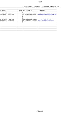 Este documento presenta el estado financiero del conjunto residencial El Paraíso para diciembre de 2014 y enero de 2015, incluyendo ingresos, egresos y saldos. Se detallan pagos por administración, servicios públicos y compras realizadas, así como deudas pendientes de cada una de las 6 casas del conjunto. Adicionalmente, se incluye un directorio telefónico con los nombres, números y correos electrónicos de los residentes de las casas 1, 2 y 5.