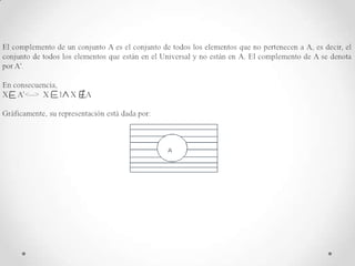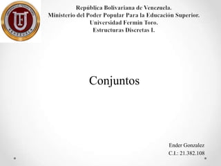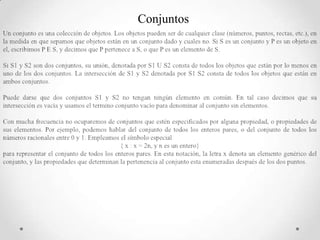 Este documento trata sobre los conceptos básicos de conjuntos, incluyendo subconjuntos, conjuntos de potencia, igualdad de conjuntos, unión e intersección, diferencia y complemento. También cubre el álgebra de conjuntos, producto cartesiano, partición, cardinalidad y fuentes bibliográficas.