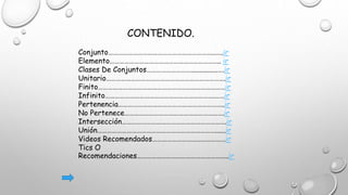 Este documento introduce los conceptos básicos de los conjuntos para estudiantes de cuarto grado. Explica que un conjunto es una agrupación de elementos que comparten características similares, y un elemento es algo individual e independiente. Describe las clases de conjuntos como vacío, unitario, finito e infinito, y conceptos como pertenencia, no pertenencia, intersección y unión. Incluye enlaces a videos recomendados para aprender más sobre conjuntos a través de ejemplos y ejercicios.