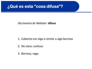 Este documento introduce los conceptos básicos de conjuntos difusos y lógica difusa. Explica que los conjuntos difusos permiten representar información vaga mediante funciones de membresía graduadas en lugar de funciones características binarias. También describe cómo se definen y representan conjuntos difusos, incluidas sus operaciones y propiedades como el soporte, núcleo y cortes alfa. Finalmente, introduce formas comunes de funciones de membresía y el concepto de complemento de conjuntos difusos.