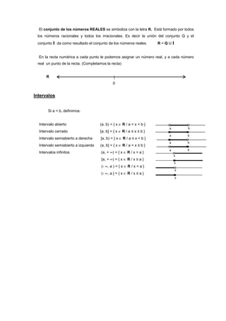 Este documento describe diferentes conjuntos numéricos y tipos de intervalos. Explica que los números naturales (N) son los números para contar y los enteros (Z) incluyen los naturales, cero y sus opuestos. Los racionales (Q) son cualquier número que pueda escribirse como fracción de enteros, mientras que los irracionales (I) tienen decimales infinitas no periódicas. Finalmente, los reales (R) son la unión de racionales e irracionales. También define intervalos abiertos, cerrados, semiabiertos y infinit