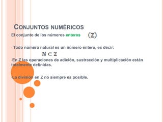 Este documento describe los principales conjuntos numéricos. Explica que el conjunto de los números naturales incluye el 0 y los números para contar, y que las operaciones de adición y multiplicación están definidas pero no siempre la sustracción y división. Luego describe que el conjunto de los enteros incluye los naturales y permite la sustracción, y que el conjunto de los racionales incluye fracciones de enteros y el conjunto de los irracionales son números decimales infinitos no periódicos. Finalmente, explica que el conjunto de los reales es la unión de los racional