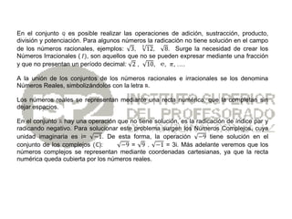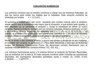 Los conjuntos numéricos comienzan con los números naturales, que incluyen números enteros positivos. Para resolver la división de enteros que no son múltiplos, se introducen los números fraccionarios puros y el conjunto de números racionales, que incluye decimales. A su vez, al abordar números que no pueden ser expresados como fracciones, se crean los números irracionales y, finalmente, los números complejos para resolver todas las operaciones matemáticas.