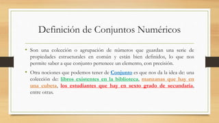Los conjuntos numéricos son colecciones de números que comparten propiedades estructurales. Se clasifican en conjuntos de números naturales, enteros, racionales, irracionales, reales y complejos. El conjunto de números naturales (N) contiene los números 1, 2, 3, etc. y es infinito, ordenable y sin último elemento. Las operaciones de suma y multiplicación en N siempre dan como resultado un número natural.