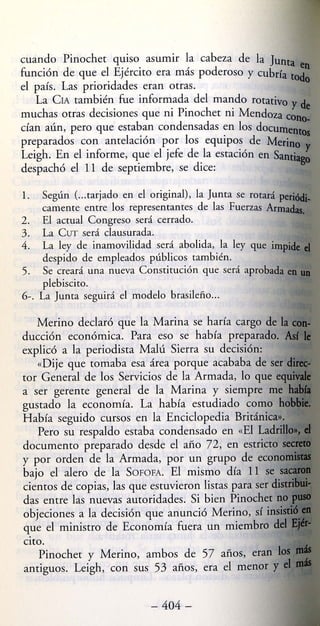 El documento describe los eventos que ocurrieron en Chile el 12 de septiembre de 1973, el día después del golpe militar que derrocó al gobierno de Salvador Allende. Describe la toma del poder por parte de la junta militar liderada por Pinochet, la persecución de partidarios de Allende, y el establecimiento de los primeros ministerios del nuevo régimen, incluyendo figuras clave como los economistas Sergio de Castro y Roberto Kelly.