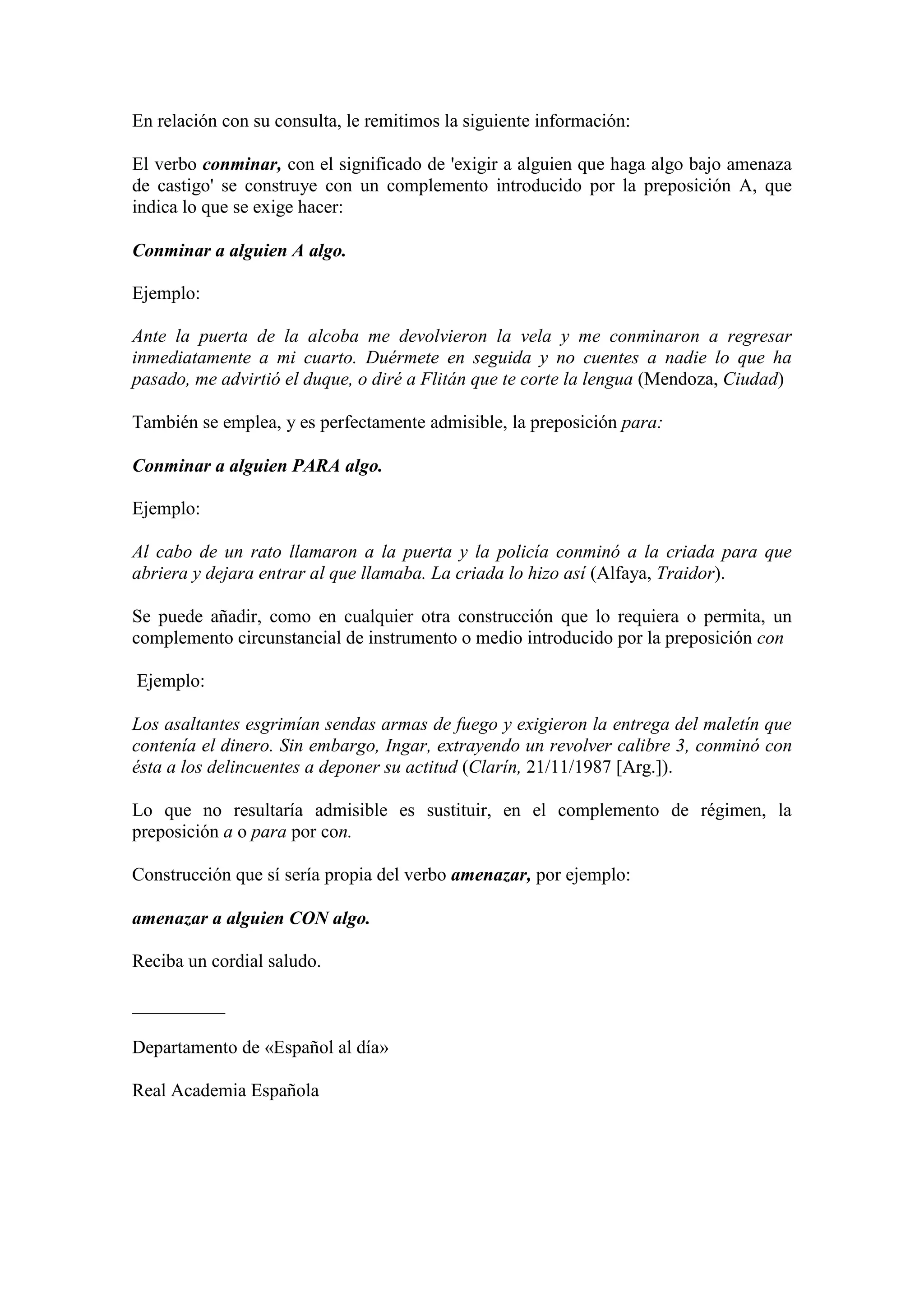 El documento explica el uso correcto del verbo "conminar", indicando que se construye con un complemento introducido por las preposiciones "a" o "para", señalando a quién o qué se le exige hacer, y opcionalmente puede incluir un complemento circunstancial de instrumento introducido por "con". Proporciona ejemplos ilustrativos de cada construcción.