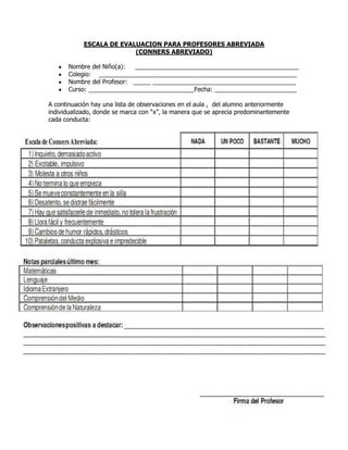 El documento proporciona una escala de evaluación abreviada para profesores que evalúa el comportamiento de un estudiante en el aula. Los profesores marcan con una "x" cómo perciben predominantemente una lista de observaciones de conducta para el estudiante.