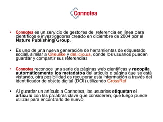Connotea es un gestor de referencias en línea, creado en 2004, que permite a científicos e investigadores guardar, organizar y compartir sus referencias a artículos científicos. Este servicio gratuito ofrece integración con diversas fuentes científicas y permite la exportación de referencias en formatos compatibles con software de gestión de citas. Su código es de código abierto y ha recibido múltiples reconocimientos en la industria de la información.