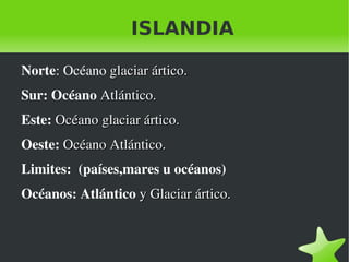 Islandia tiene una capital llamada Reikiavik, con una población de alrededor de 331,000 habitantes. Se encuentra en el norte del Océano Atlántico, rodeada por el Océano Ártico y el Atlántico. El paisaje incluye montañas como Tarawera y ríos como Hivita, Logurinn y Jorsa. El clima polar y la escasez de vegetación definen el territorio.