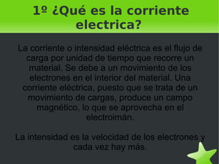 El documento describe los conceptos básicos de la corriente eléctrica, incluyendo que es una corriente continua de electrones (corriente directa) o una corriente que cambia de dirección cíclicamente (corriente alterna), y clasifica los materiales como aislantes, conductores o semiconductores. También explica que la electricidad se puede generar a partir de fuentes como plantas de energía y que la electricidad estática ocurre cuando un objeto acumula carga sin poder conducirla. Finalmente, define electroimanes y elementos básicos de circuit