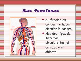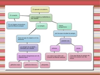 El documento describe el sistema circulatorio humano, incluyendo sus funciones principales de transportar la sangre por todo el cuerpo, los dos tipos de circulación (mayor y menor), los componentes clave como arterias, venas, corazón y sangre, y sus funciones respectivas. Explica que la circulación mayor transporta la sangre oxigenada desde el corazón a través de las arterias a los órganos y luego de regreso a través de las venas, mientras que la circulación menor transporta la sangre desde el corazón a los pulmones para recoger oxí