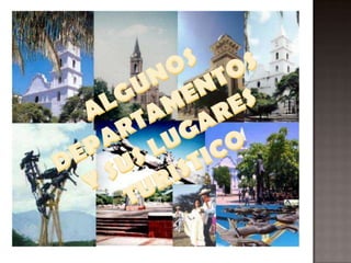 Este documento presenta información sobre varios departamentos de Colombia y sus principales lugares turísticos. Describe que Amazonas se encuentra en el sur del país y es conocido por su biodiversidad natural y el río Amazonas. Luego menciona algunos lugares turísticos populares de departamentos como Antioquia, Bolívar, Boyacá, Caldas, La Guajira, Nariño y San Andrés, así como las atracciones de Vichada como sus paisajes naturales, fauna y vegetación.