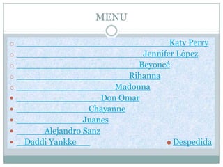 Este documento presenta resúmenes biográficos breves de 10 cantantes populares: Katy Perry, Jennifer López, Beyoncé, Rihanna, Madonna, Don Omar, Chayanne, Juanes, Alejandro Sanz y Daddy Yankee. Cada resumen incluye información sobre su lugar y fecha de nacimiento, antecedentes familiares, y una breve descripción de sus inicios musicales.