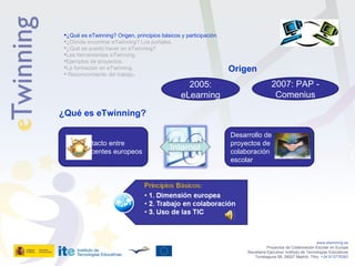 eTwinning es una iniciativa que promueve la colaboración escolar en Europa, permitiendo a docentes de diferentes países trabajar juntos en proyectos educativos a través de Internet. El documento detalla los objetivos, herramientas y ejemplos de proyectos, así como la formación y reconocimiento del trabajo realizado en esta plataforma. Fundado en 2005, eTwinning abarca todas las etapas educativas y áreas de conocimiento, facilitando la creación de una comunidad educativa internacional.