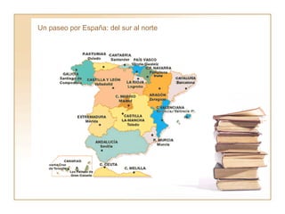 Este documento presenta una lista de monumentos, museos y lugares de interés en diferentes regiones de España, incluyendo el País Vasco, Cataluña, Navarra, Aragón, La Rioja, Galicia, Cantabria, Asturias, Islas Canarias e Islas Baleares. Entre los lugares destacados se encuentran el Parque Güell, la Sagrada Familia y el Museo Picasso en Barcelona, el Teatro-Museo Dalí en Figueras, el Monasterio de Piedra en Zaragoza, la Catedral de Logroño