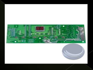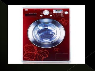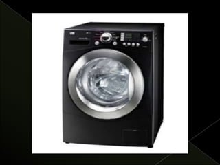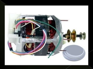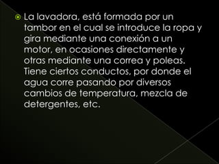 El documento describe el funcionamiento y las partes de una lavadora, incluyendo su tambor, motor eléctrico, microprocesador y temporizador. Detalla cómo el tambor gira para mezclar la ropa con agua y detergentes, y cómo el motor recibe energía eléctrica controlada por un microprocesador. Además, el temporizador regula el tiempo de los ciclos de lavado.